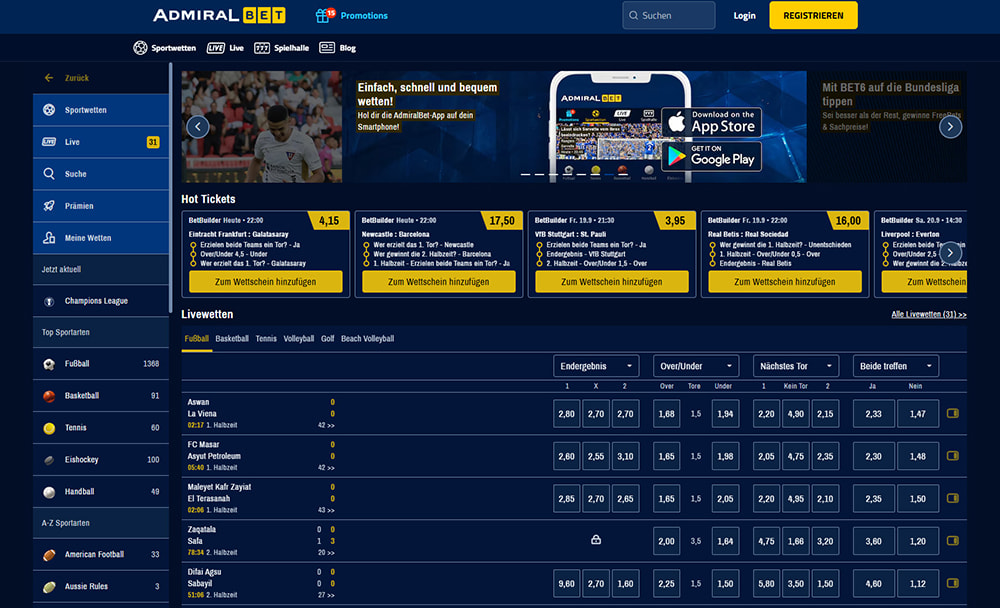 Ihr müsst euch nicht durch verschachtelte Menüs klicken, um eine Wette zu finden. Auch absolute Anfänger finden sich sofort zurecht. Unser AdmiralBet Test bestätigt: Der Anbieter setzt auf eine bewährte und intuitive Struktur, bei der die schnelle und einfache Wettabgabe im Vordergrund steht.
