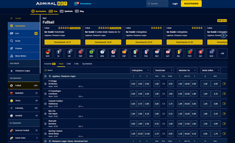 Die Funktion selbst ist Standard – sie funktioniert tadellos und ist selbsterklärend. Was fehlt, ist das gewisse Extra im Vergleich zur Konkurrenz. Neben der klassischen Fußball-Wette online besonders häufig angeboten werden Einzelwetten, Kombiwetten, Systemwetten sowie Livewetten. So findet ihr bei AdmiralBet einen Quoten-Boost für Kombiwetten, den ihr unter anderem auch beim Sportwettenanbieter bwin findet.