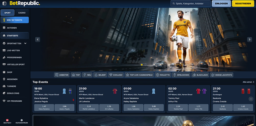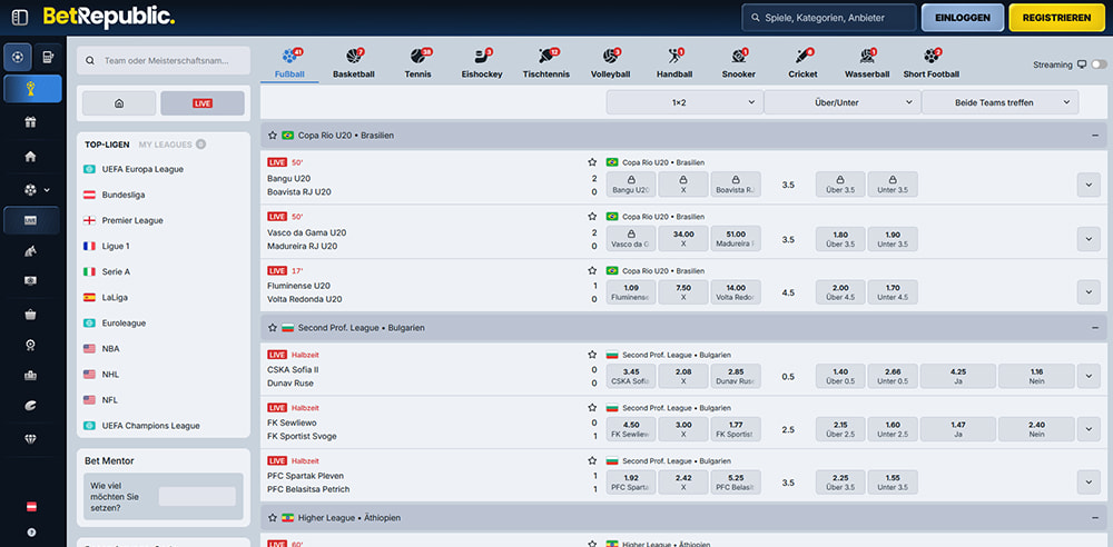 Die BetRepublic Sportwetten umfassen über 40 Sportarten. Fußball dominiert mit über 3.000 verfügbaren Partien, aber